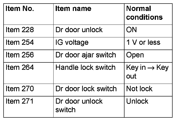 NO [Normal condition is not displayed for item No. 270, 271.] : Troubleshoot the ETACS-ECU. Refer to Diagnosis - Inspection Procedure 4 "ETACS-ECU does not receive any signal from front door lock actuator". Inspection Procedure 4