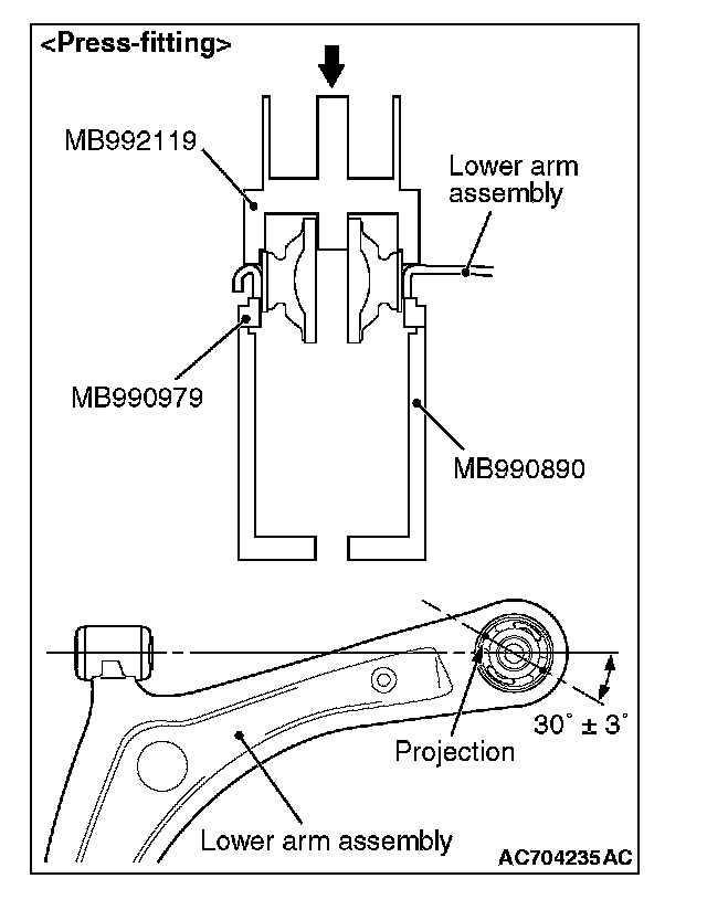 4. Press-fit the bushing until the special tool contacts with the lower arm assembly.