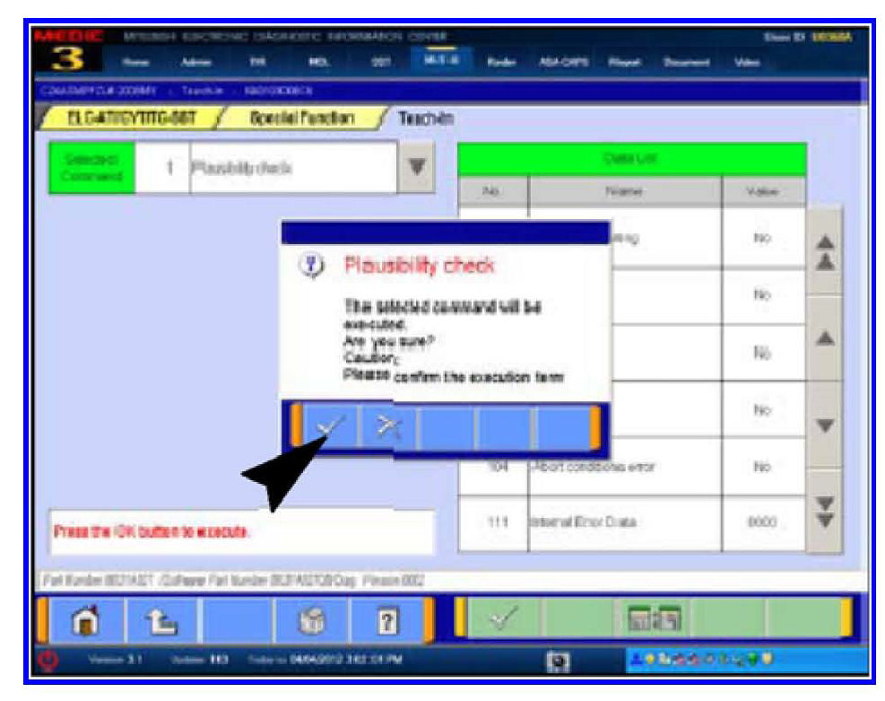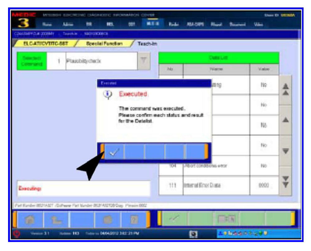 12. When the procedure is complete, the Executed dialog box advises Selected Command 1 Plausibility Check was completed and requests confirmation of the results in the Data List Column.