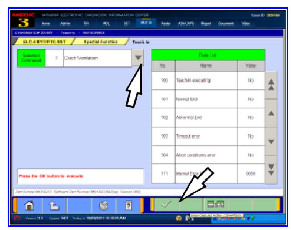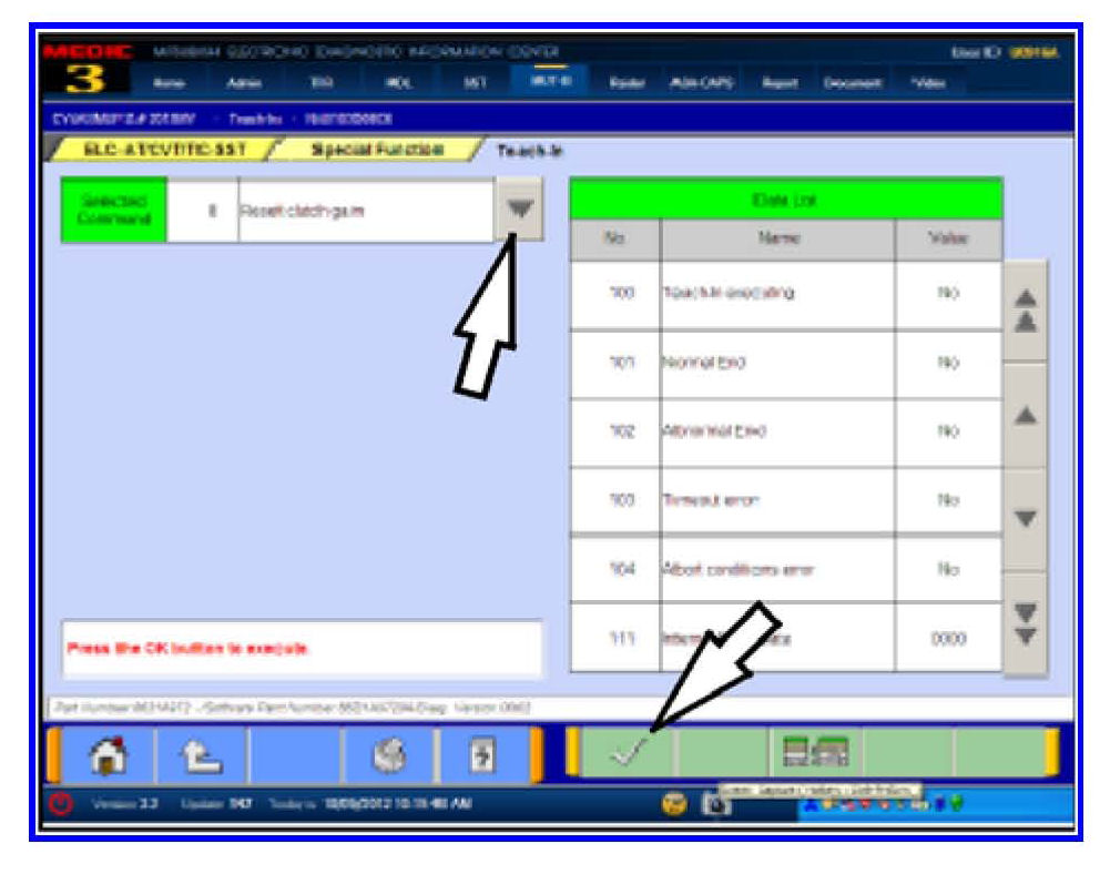 If TCM software is 0001 (unlike example at left), reset Clutch Gain will not appear in the Selected Command column and does not need completion.