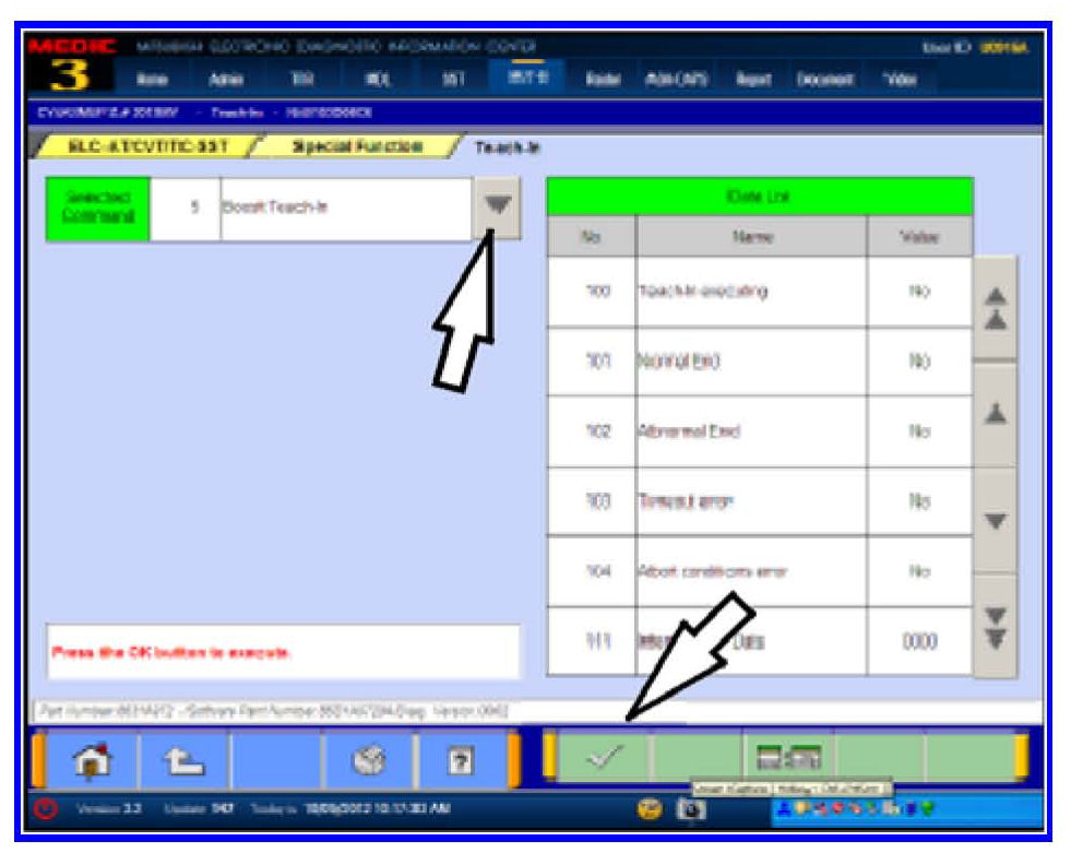 When the procedure is complete, the engine returns to idle and the Executed dialog box advises that Selected Command 2 Shift Fork Teach-In was completed and requests confirmation of the results in the Data List column.