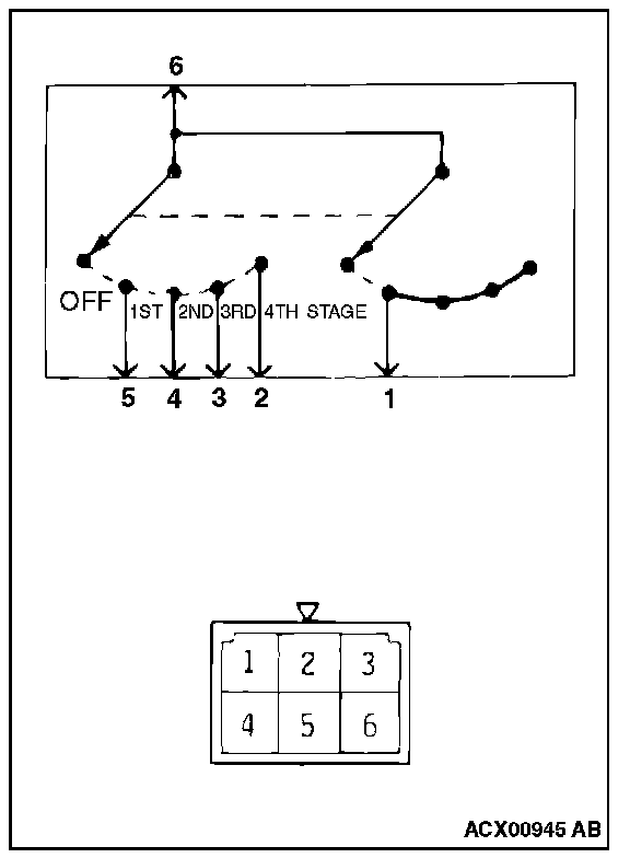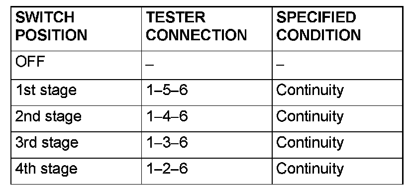 This figure illustrates a complex switch. The continuity between terminals at each position is as indicated in the table below.
