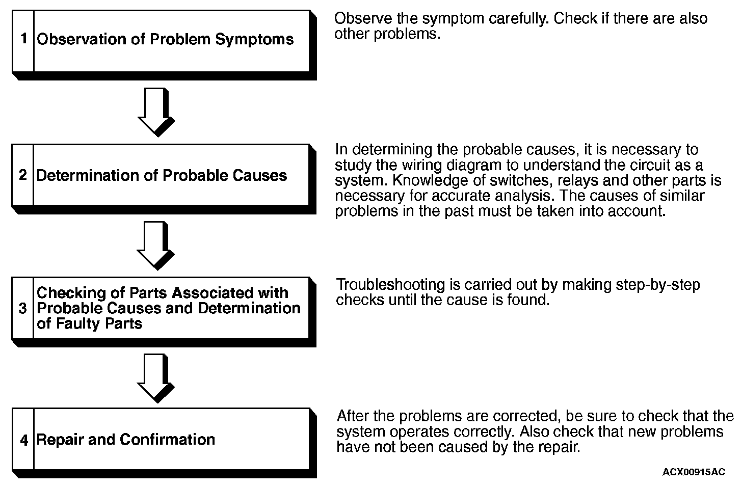 If an attempt is made to solve a problem without going through correct steps for troubleshooting, the symptoms could become more complicated, resulting in failure to determine the causes correctly and making incorrect repairs. The four steps below should be followed in troubleshooting.