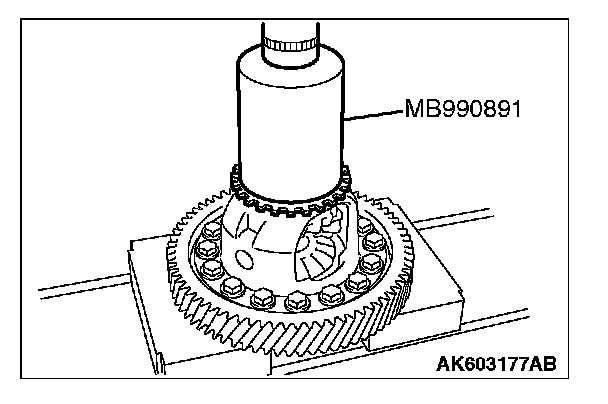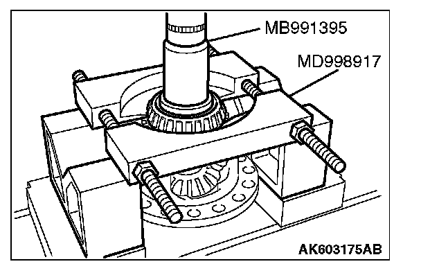 1. Using special tool MD998917 and MB991395, support the tapered roller bearing inner race, and then set them on the press.