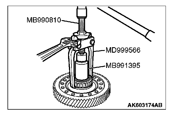 1. Using special tool MB990810, MD999566 and MB991395, remove the tapered roller bearing inner race.