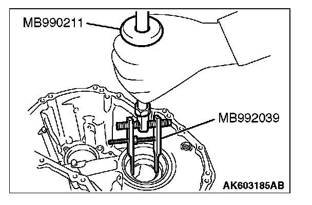 Using special tools MB990211 and MB992039, remove the tapered roller bearing outer race.