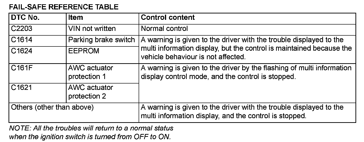 FAIL-SAFE FUNCTIONIf an abnormality occurs to the signal of sensors, switches, solenoids, or others, the AWC-ECU performs a control for the driver safety and system protection. The control contents are as follows.