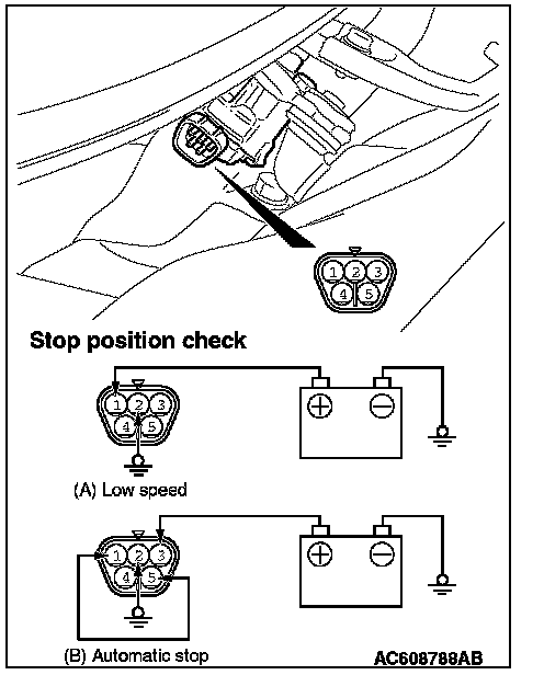 2. Run the windshield wiper motor at low speed, then disconnect the battery in the middle of the motor rotation and check to see that the motor stops.