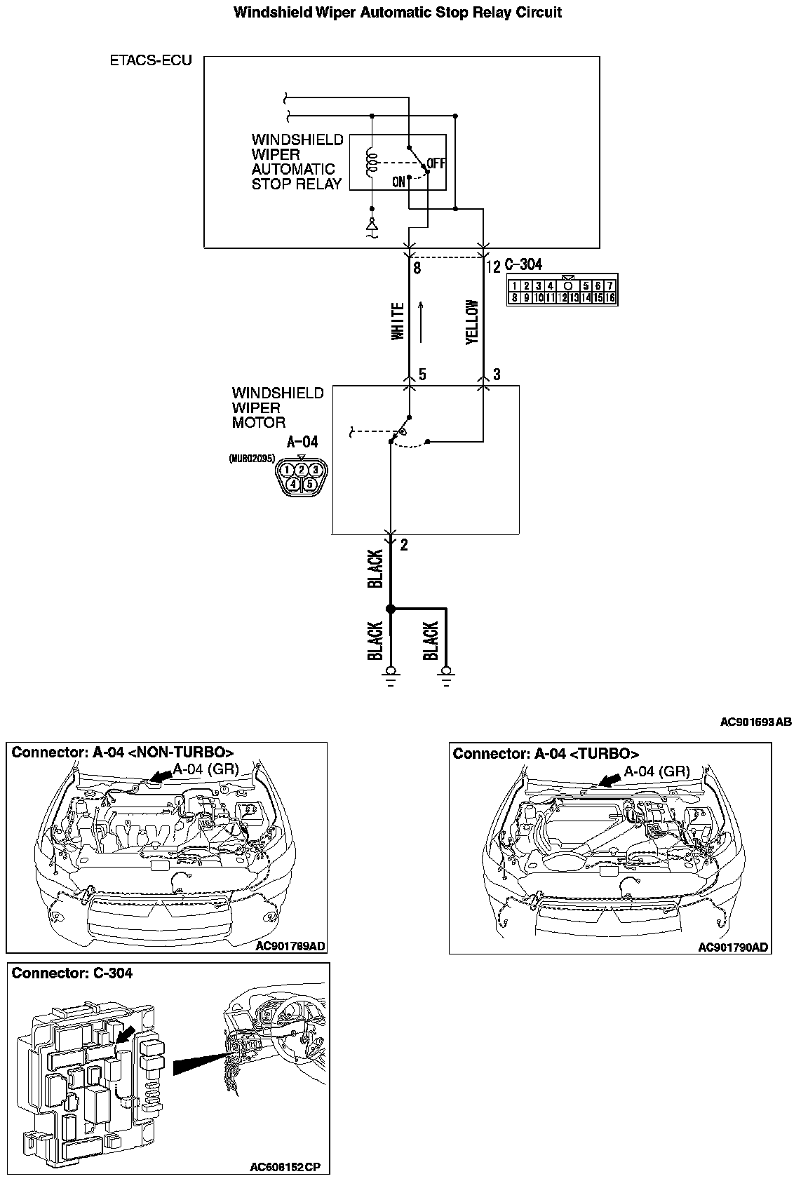 STEP 5. Check the wiring harness between ETACS-ECU connector C-304 (terminals 8, 12) and windshield wiper motor connector A-04 (terminals 5, 3).