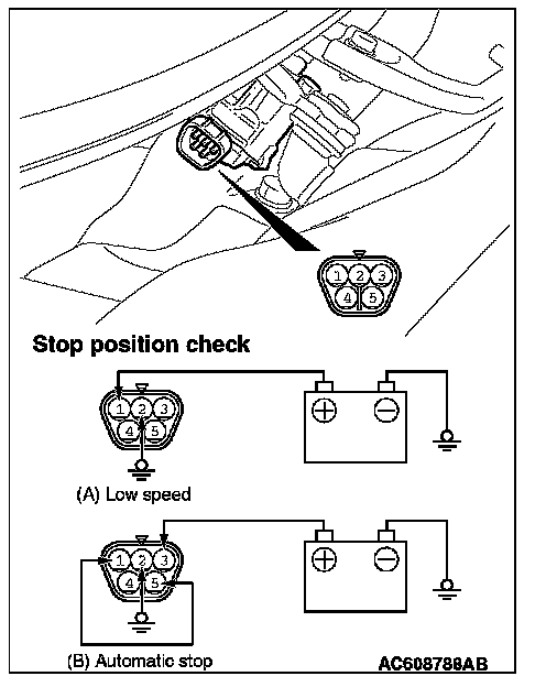 2. Connect the vehicle battery to the windshield wiper motor connector as shown, and operate the windshield wiper at low speed. While the windshield wiper is working, disconnect the battery at positions other than the specified park position to stop the windshield wiper motor.