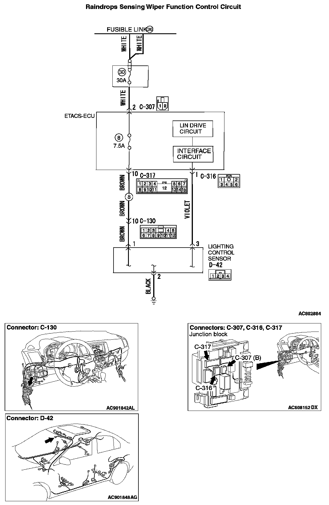 The windshield wiper motor, the column switch, the lighting control sensor, the harness connector, or the ETACS-ECU may be defective.