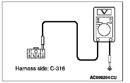 2. Measure the voltage between C-316 ETACS-ECU connector terminal No. 1 and body ground.