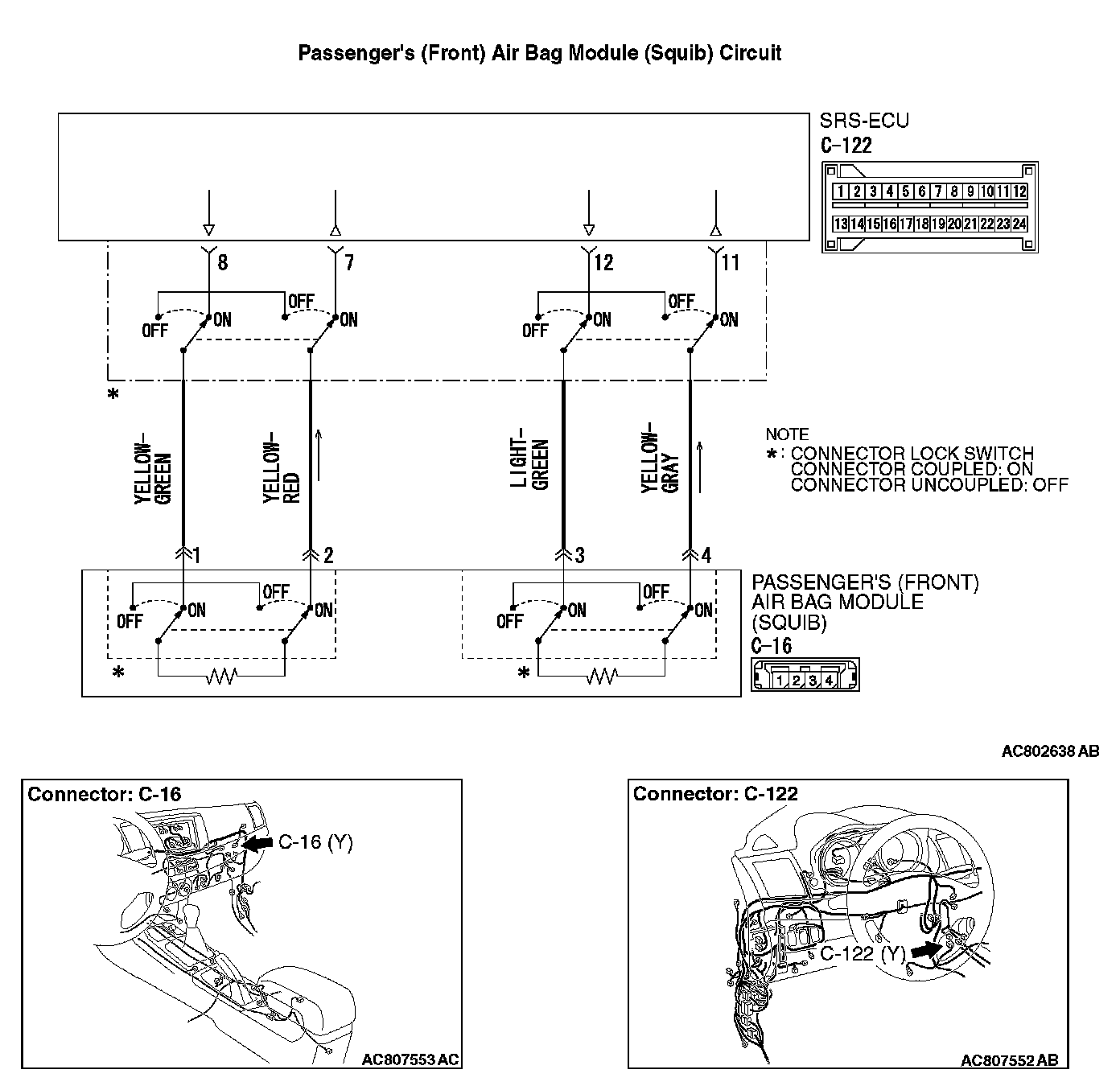 - SRS-ECU connector C-122 (terminal No.7) and the passenger's (front) air bag module connector C-16 (terminal No.2) [1st squib]