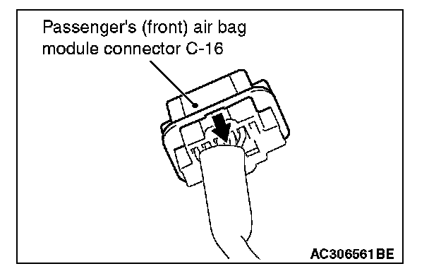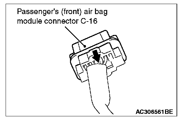 2. Disconnect C-16 passenger's (front) air bag module harness side connector while sliding toward the arrow direction.