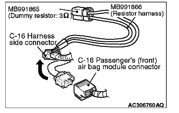 4. Insert special tool MB991866 into the harness side connector C-16 (terminal No.1 and 2 [1st squib] or terminal No.3 and 4 [2nd squib]) by backprobing.