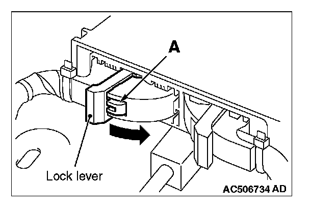 2. While pushing the part "A" indicated in the figure of the harness side connector, turn the lock lever to the direction of the arrow to release the lock lever, and disconnect the C-122 SRS-ECU connector.