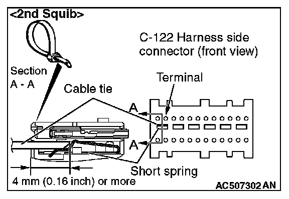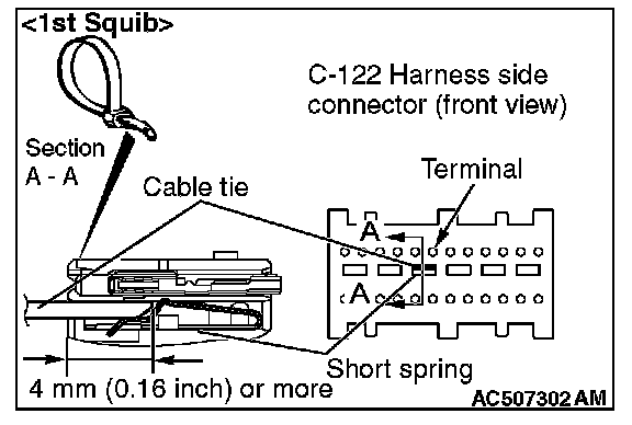 4. Insert a cable tie [3 mm (0.12 inch) wide, 0.5 mm (0.02 inch) thick] between terminals 7 and 8 [1st squib] or 11 and 12 [2nd squib], and the short spring to release the short spring.