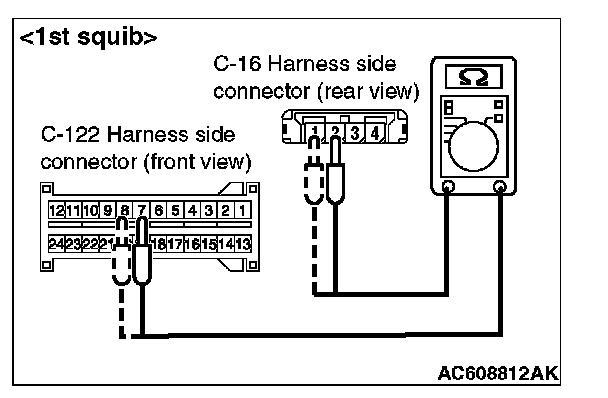 - SRS-ECU connector C-122 (terminal No.8) and the passenger's (front) air bag module connector C-16 (terminal No.1) [1st squib]