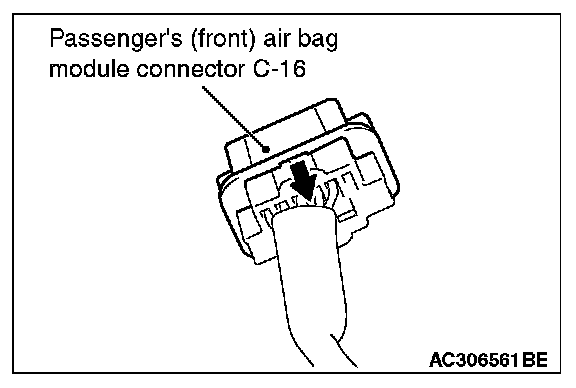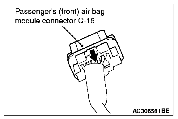 2. Disconnect C-16 passenger's (front) air bag module harness side connector while sliding toward the arrow direction.