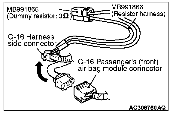 4. Insert special tool MB991866 into the harness side connector C-16 (terminal No.1 and 2 [1st squib] or terminal No.3 and 4 [2nd squib]) by backprobing.