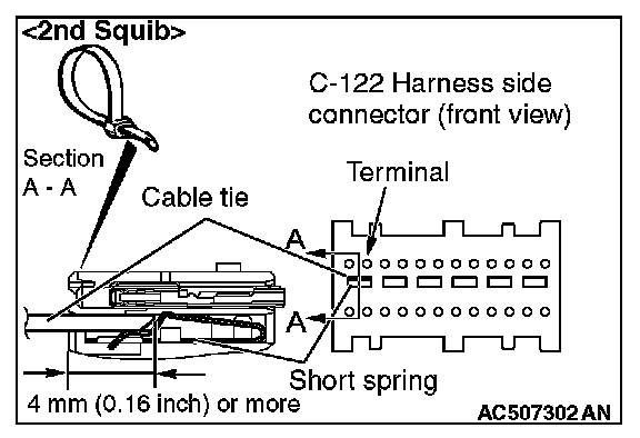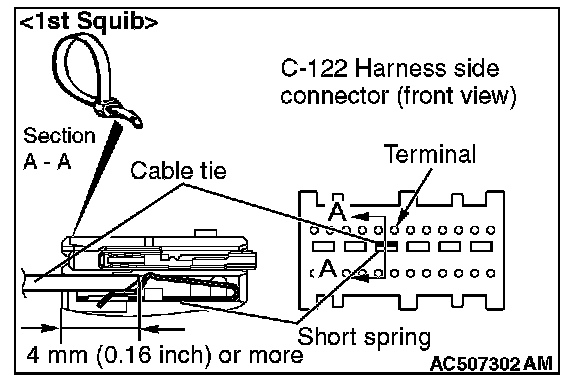 4. Insert a cable tie [3 mm (0.12 inch) wide, 0.5 mm (0.02 inch) thick] between terminals 7 and 8 [1st squib] or 11 and 12 [2nd squib], and the short spring to release the short spring.