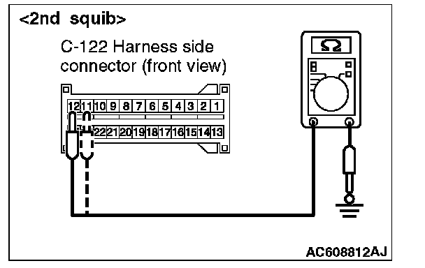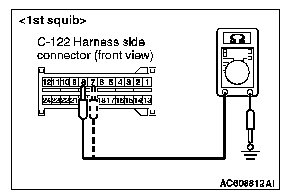 5. Check for continuity between C-122 harness side connector terminals 7 and 8 [1st squib] or 11 and 12 [2nd squib], and body ground.
