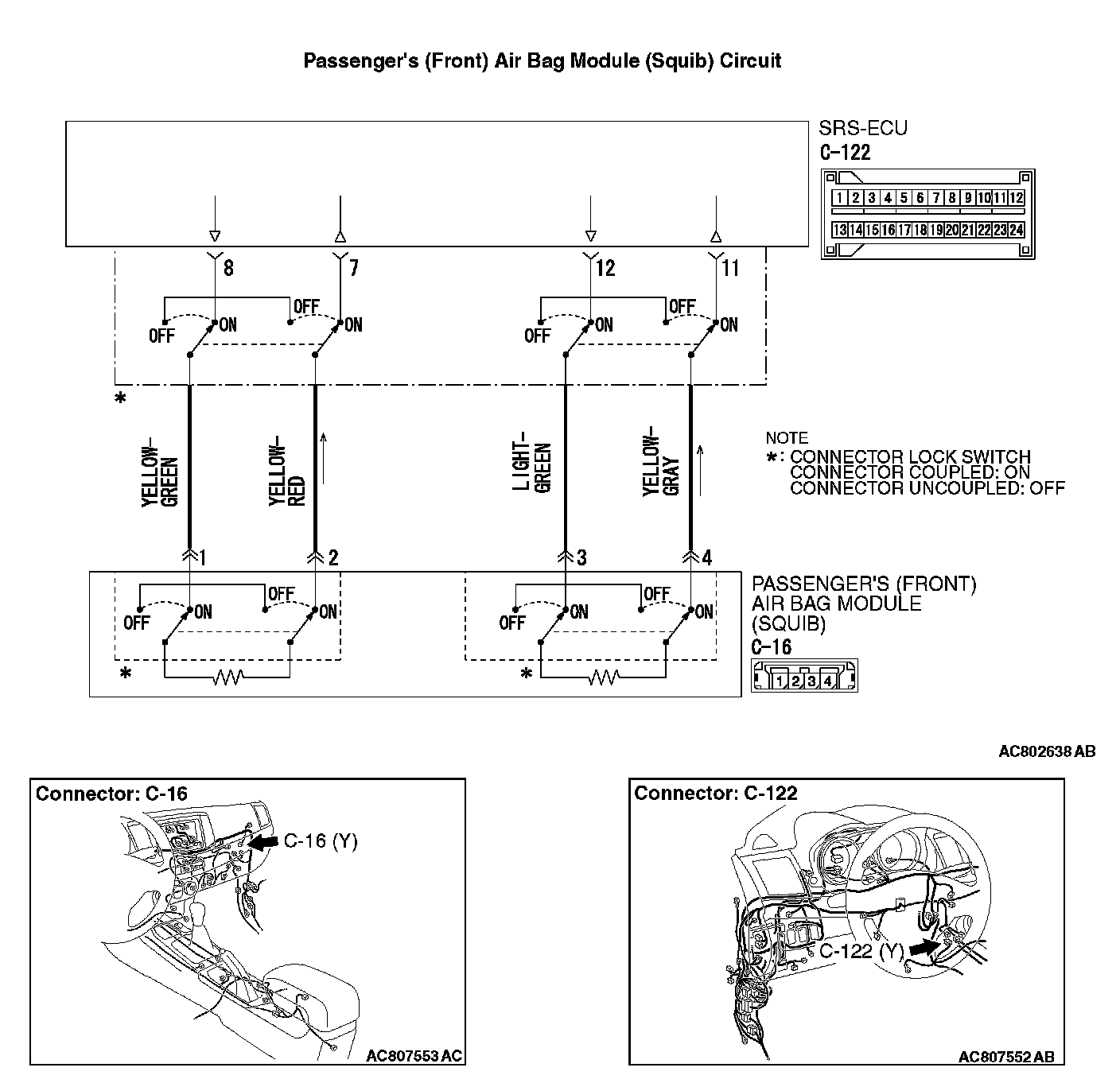 - SRS-ECU connector C-122 (terminal No.7 and 8) and passenger's (front) air bag module connector C-16 (terminal No.2 and 1) [1st squib].