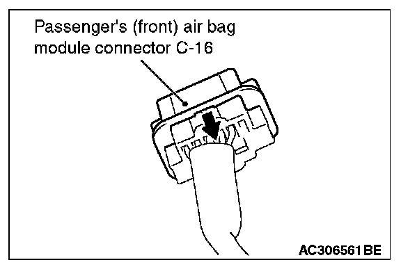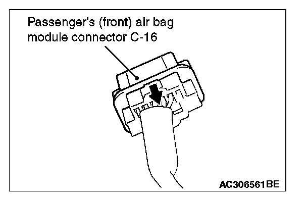 3. Disconnect C-16 passenger's (front) air bag module harness side connector while sliding toward the arrow direction.