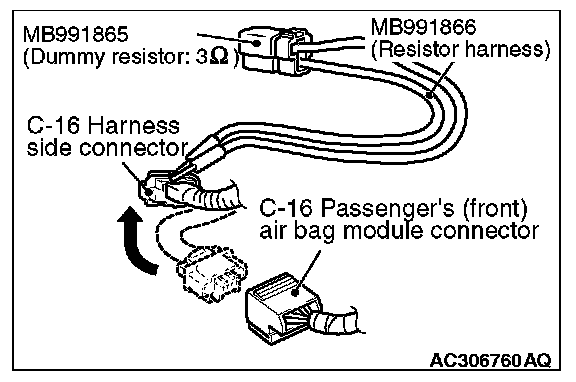 4. Insert special tool MB991866 into the harness side connector C-16 (terminal No.1 and 2 [1st squib] or terminal No.3 and 4 [2nd squib]) by backprobing.
