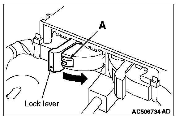 2. While pushing the part "A" indicated in the figure of the harness side connector, turn the lock lever to the direction of the arrow to release the lock lever, and disconnect the C-122 SRS-ECU connector.