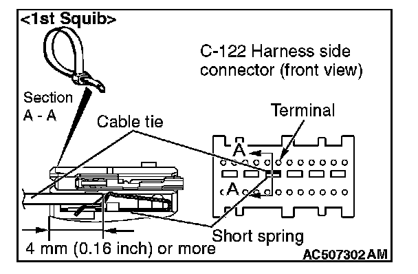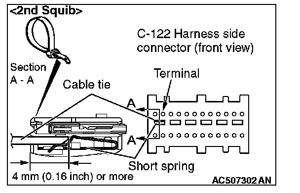 4. Insert a cable tie [3 mm (0.12 inch) wide, 0.5 mm (0.02 inch) thick] between terminals 7 and 8 [1st squib] or 11 and 12 [2nd squib], and the short spring to release the short spring.