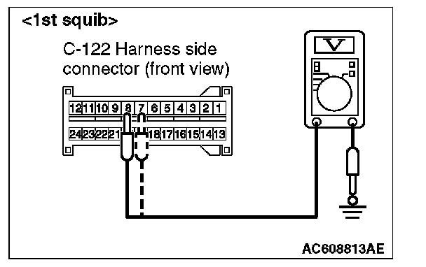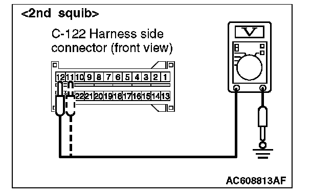 7. Measure the voltage between C-122 harness side connector terminals 7 and 8 [1st squib] or 11 and 12 [2nd squib] and body ground.