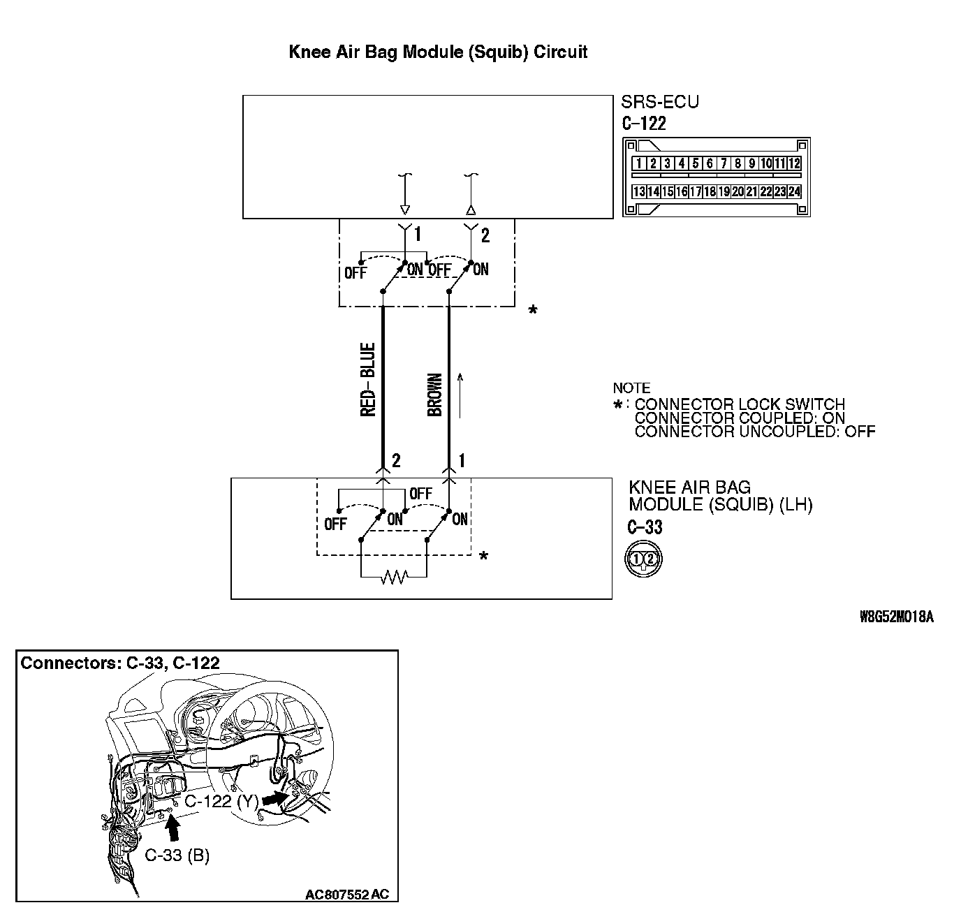 STEP 5. Check the harness wires for short circuit to power supply between SRS-ECU connector C-122 (terminal No.1 and 2) and knee air bag module connector C-33 (terminal No.2 and 1).