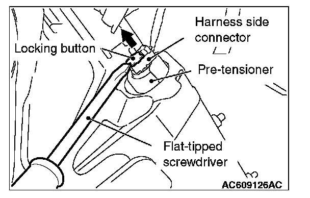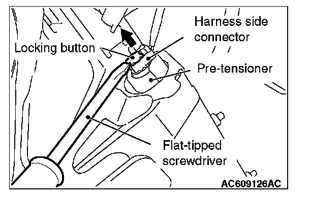 2. Disconnect knee air bag module connector C-33. Use a flat-tipped screwdriver to unlock the locking button at the harness side connector by withdrawing it toward you in two stages, and then disconnect the connector.