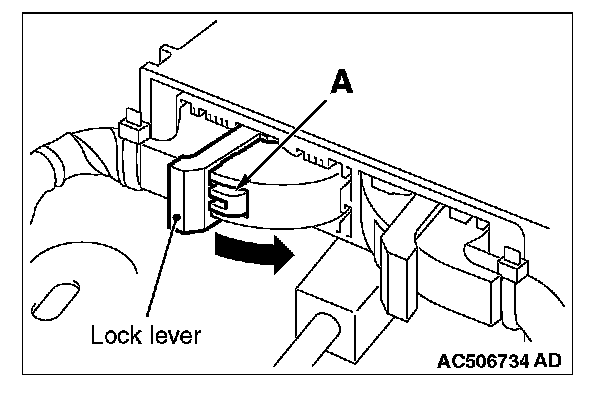 2. While pushing the part "A" indicated in the figure of the harness side connector, turn the lock lever to the direction of the arrow to release the lock lever, and disconnect the C-122 SRS-ECU connector.