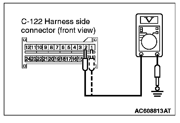 7. Measure the voltage between C-122 harness side connector terminals 1, 2 and body ground.
