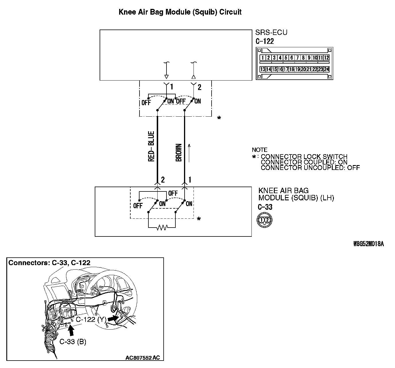 STEP 4. Check the harness for open circuit between SRS-ECU connector C-122 (terminal No.1 and 2) and the knee air bag module C-33 (terminal No.2 and 1).