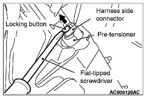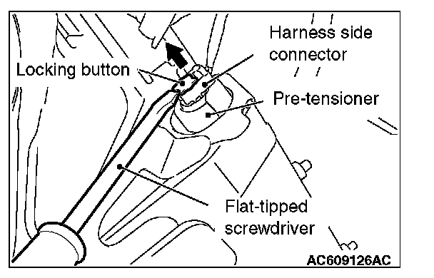 3. Disconnect SRS-ECU connector C-122 and knee air bag module connector C-33, and measure at the wiring harness side. For connector C-33, use a flat-tipped screwdriver to unlock the locking button at the harness side connector by withdrawing it toward you in two stages, and then disconnect the connector.