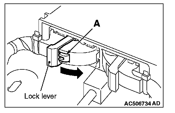 2. While pushing the part "A" indicated in the figure of the harness side connector, turn the lock lever to the direction of the arrow to release the lock lever, and disconnect the C-122 SRS-ECU connector.