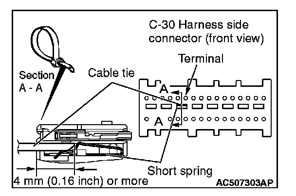 4. Insert a cable tie [3 mm (0.12 inch) wide, 0.5 mm (0.02 inch) thick] between terminal 41, 42 and the short spring to release the short spring.