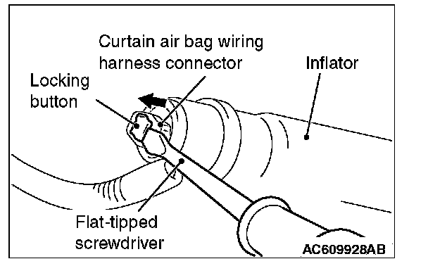 2. Disconnect curtain air bag module (LH) F-24. Use a flat-tipped screwdriver to unlock the locking button at the harness side connector by withdrawing it toward you in two stages, and then disconnect the connector.