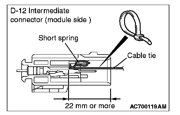 4. Because the short spring is installed to the D-12 intermediate connector (curtain air bag harness side), insert a cable tie [3 mm (0.12 inch) wide, 0.5 mm (0.02 inch) thick] between terminals 1, 2 and the short spring to release the short spring.