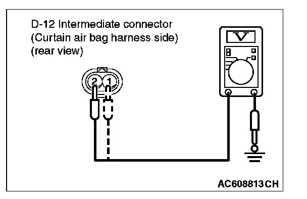 7. Check for continuity between the D-12 intermediate connector (curtain air bag harness side) terminal No. 1, 2 and the body ground.