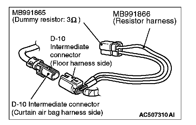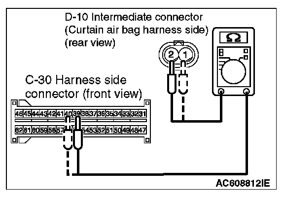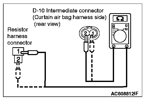 STEP 5. Resistance measurement at the D-10 intermediate connector terminal No. 1, 2 and the F-05 curtain air bag module harness side connector terminal No. 1, 2.