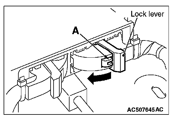 2. While pushing the part "A" indicated in the figure of the harness side connector, turn the lock lever to the direction of the arrow to release the lock lever, and disconnect the C-30 SRS-ECU connector.