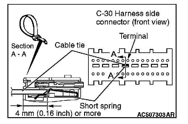 4. Insert a cable tie [3 mm (0.12 inch) wide, 0.5 mm (0.02 inch) thick] between terminal 39, 40 and the short spring to release the short spring.