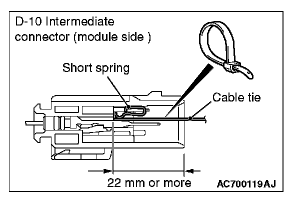 4. Because the short spring is installed to the D-10 intermediate connector (curtain air bag harness side), insert a cable tie [3 mm (0.12 inch) wide, 0.5 mm (0.02 inch) thick] between terminals 1, 2 and the short spring to release the short spring.