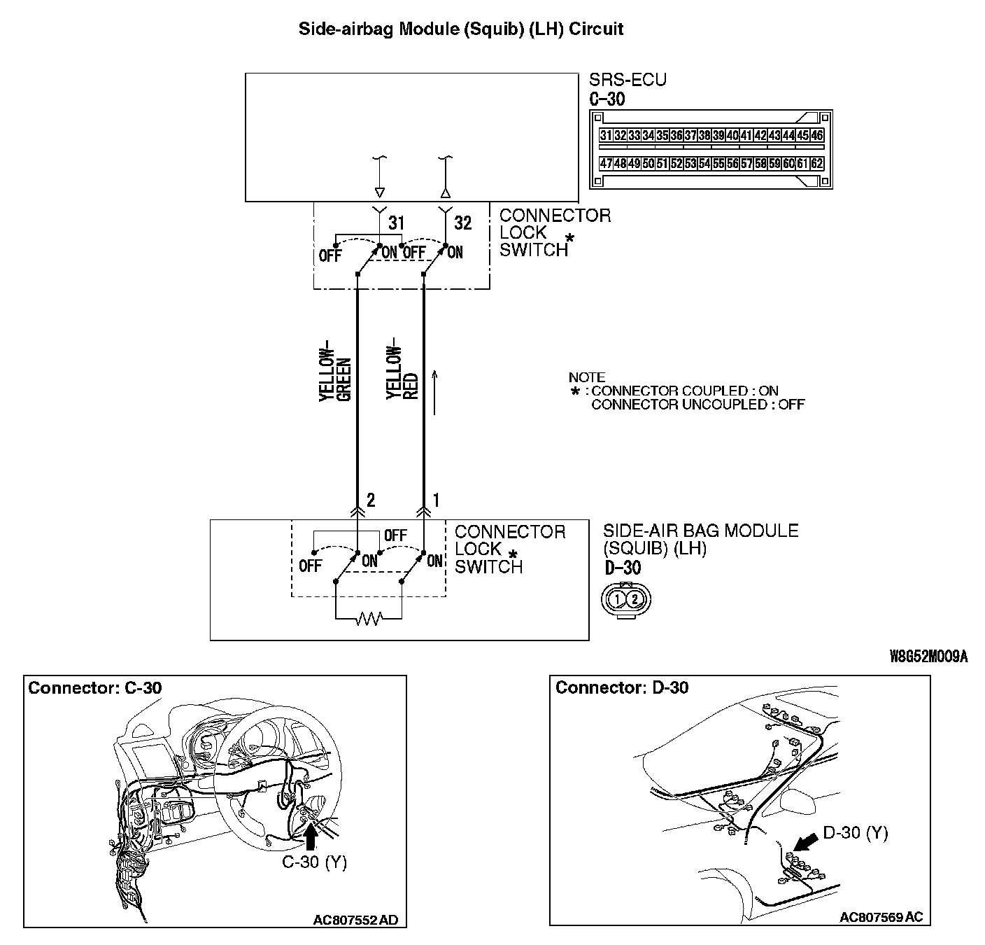 NOTE: *: The squib circuit connectors integrate a "short" spring (which prevents the air bag from deploying unintentionally due to static electricity by shorting the positive wire to the ground wire in the squib circuit when the connectors are disconnected). Therefore, if connector C-30 or D-30 is damaged or improperly engaged, the short spring may not be released when the connector is connected.