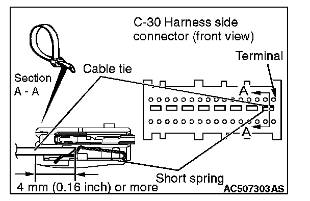 4. Insert a cable tie [3 mm (0.12 inch) wide, 0.5 mm (0.02 inch) thick] between terminals 31, 32 and the short spring to release the short spring.