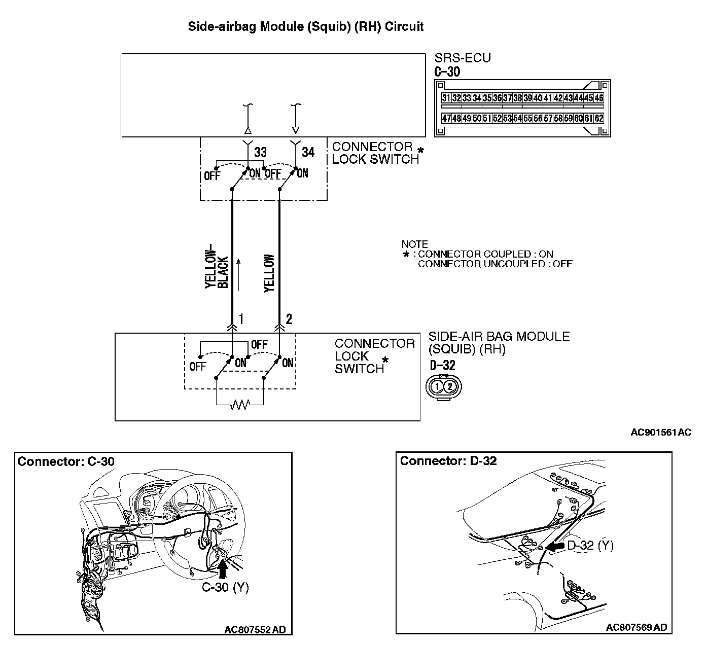 STEP 5. Check the harness wires for short circuit to ground between SRS-ECU connector C-30 (terminal No.33 and 34) and side-airbag module (RH) connector D-32 (terminal No.1 and 2).